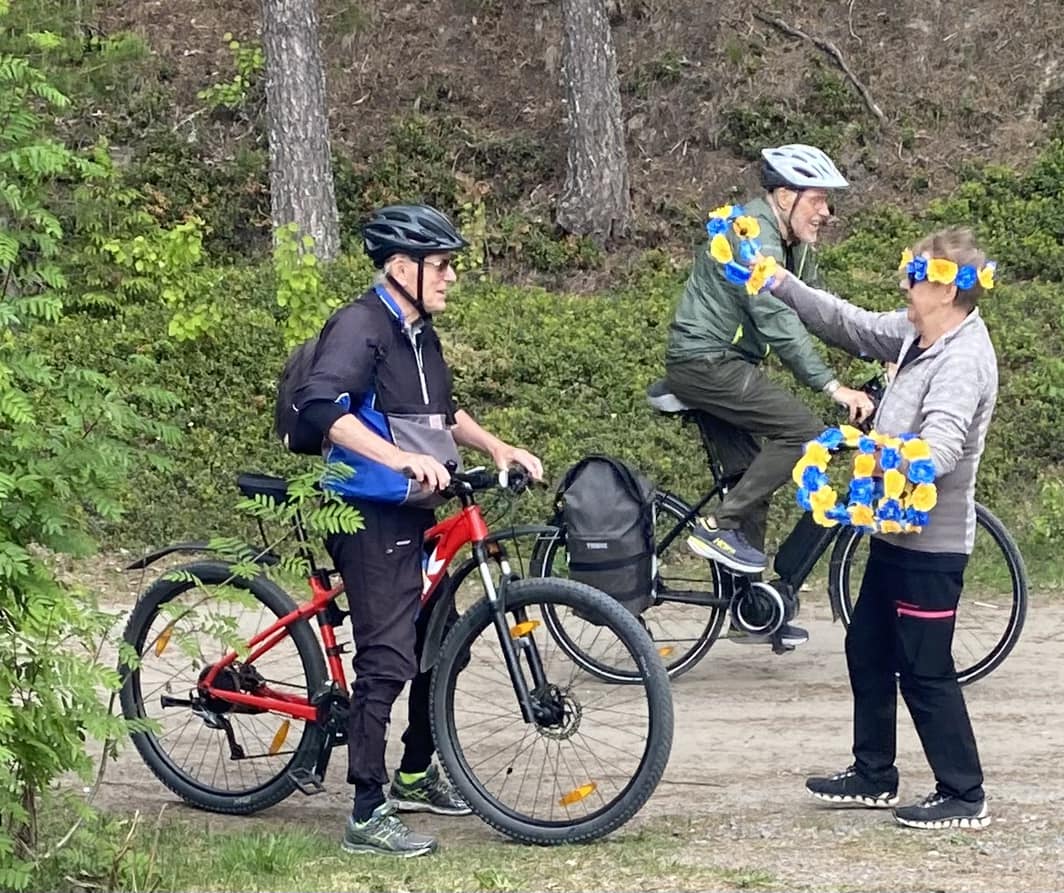 . Cyklisterna fick blomsterkransar vid ankomsten av vår egen kranskulla Monica