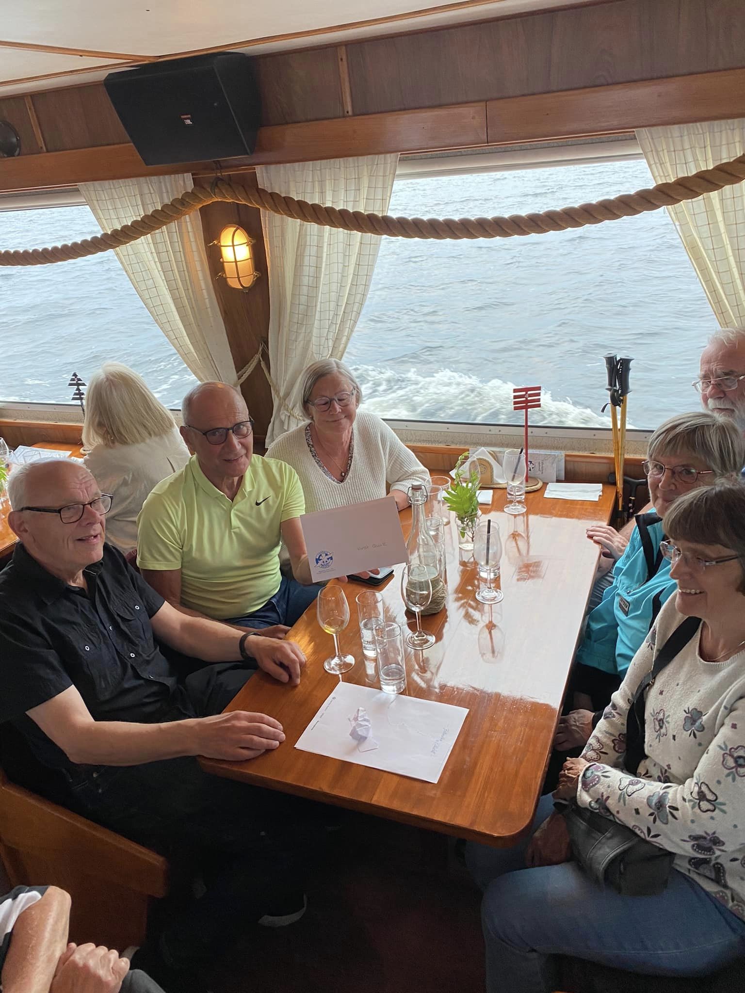Den 24 juni var det ett 30-tal aktiva med på Kryssa och Quizza på Laponia. Härlig kväll med Stefan Gunnarsson på Laponia. ”Stad i ljus” lyfte taket på båten. Ganska svårt quiz men ett av Aktiva seniorers bord vann och vinsten ett presentkort på 1000:- lottades bland de sex runt bordet.